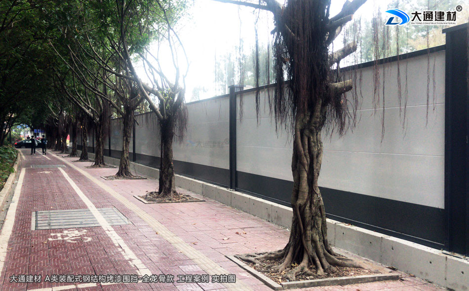 深圳市大通建材圍擋烤漆全龍骨A款是一款施工用防護隔離圍擋。大通建材圍擋A款采用鋼結構設計,安裝穩固,抗風力強力;裝配式,拆裝與運輸都很便捷;雙面烤漆鋼板,表面十分光滑,色調溫和美觀;不易銹蝕,可以很好地抵御強酸強堿的侵蝕,可循環使用。