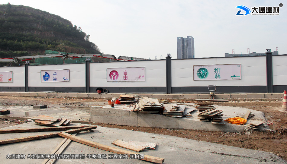 大通建材A類烤漆鋼圍擋-半龍骨款,是一款新型裝配式鋼結構圍擋,圍擋的上下橫梁均為50x50mm深灰色烤漆方通,立柱為300x200mm深灰色烤漆矩形方鋼,2.5米高的每一擋圍擋有8塊(6塊白色、2塊深灰色)烤漆墻板,由左右兩塊墻板與中間暗柱、左右立柱連接組成,安裝得當可以防御10級以上的臺風。了解更多“大通建材A類烤漆鋼圍擋-半龍骨款”的定制生產、配送安裝、價格與規格等詳情,請直接致電13826562448梁先生 進行溝通