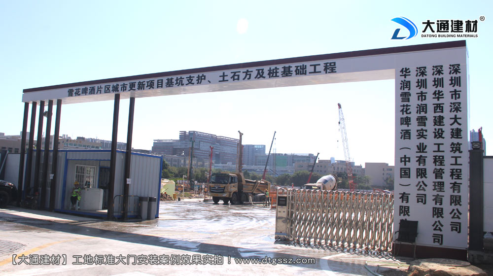 雪花啤酒(中國)有限公司,深圳雪花啤酒廠片區基坑支護、土石方與樁基工程施工大門定制安裝, 位于廣東省深圳市寶安區新安街道留仙三路,由深圳市深大建筑工程有限公司施工,工地大門選擇深圳市大通建材有限公司定制的鋼結構工地施工大門,工地大門已經安裝完成,現場實拍照片展示;
