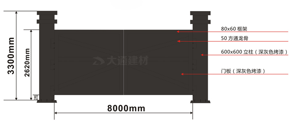 大通建材鋼結(jié)構(gòu)烤漆款標(biāo)準(zhǔn)工地大門(mén),不僅工地大門(mén)的門(mén)板與立柱的顏色可定制,工地大門(mén)的尺寸規(guī)格(長(zhǎng)度、高度)等也可定制化生產(chǎn)。