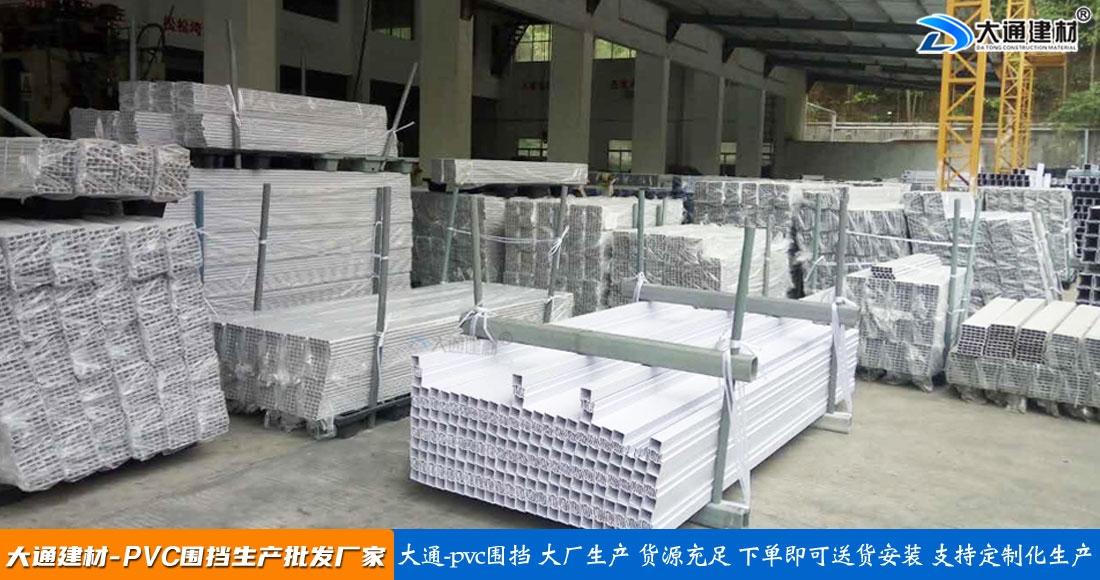 深圳市大通建材生產批發的市政標準PVC圍擋的圍擋墻板采用PVC長條版拼接,立柱、橫管均為PVC材料,內部均襯方通。立柱底板為鋼板,并加斜撐受力,來保證PVC圍擋抗風力更強、更安全穩固。大通建材常規款PVC圍擋尺寸長3mx高2.5m、長3mx高2.2m、長3mx高2m 其它PVC圍擋尺寸可按實際需要進行定制生產。